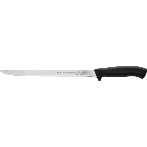 Aufgeschnittener Schinken sieht schöner aus und schmeckt besser, wenn er in ganz hauchdünne Scheiben geschnitten ist. Das ProDynamic Schinkenmesser 85004252 von DICK ist mit einer langen flexiblen Klinge ausgestattet und sorgt für feine dünne Schnitte. Die Messer der Serie ProDynamic finden in der Gastronomie, in Großküchen und im Thekenbereich ihren Einsatz. Sie zeichnen sich durch ein geringes Gewicht aus und ermöglichen ein längeres ermüdungsfreies Arbeiten. Der ergonomisch geformte Vollkunststoffgriff und die Qualitätsklinge aus Edelstahl ergeben ein modernes Messer in klarem Design.Art.-Nr.: 1707836